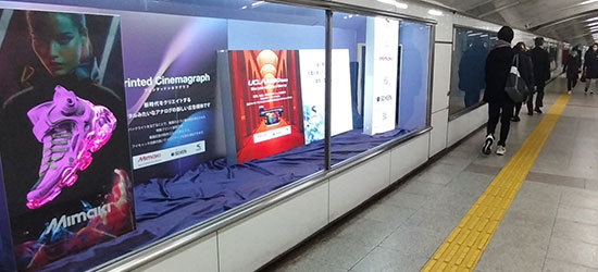 産業用プリンターメーカーの認知も兼ね駅構内に掲出された、印刷なのに絵が動くような斬新な演出のファブリック看板は、通行人のアテンション効果を高めました。