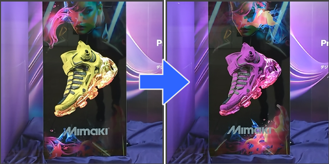 バックライトが点灯することで異なるデザインに変わる印刷技術「リライトプリント」の応用で、バックライトをマッピング、コントロールすることでデザイン自体の色を変えることも出来るファブリック看板です。